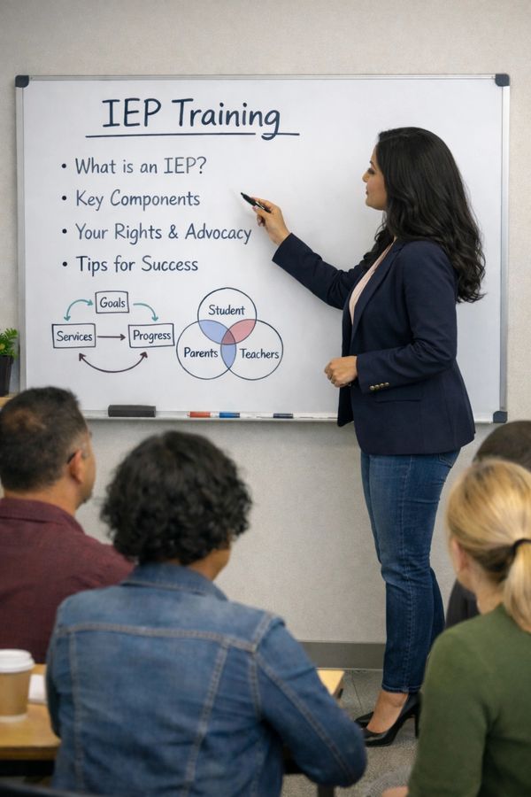 In Person or Virtual to all meetings; IEP, 504 Plan, Suspension, School, Progress Report, Dispute Resolution, Mediation and Impartial Hearings